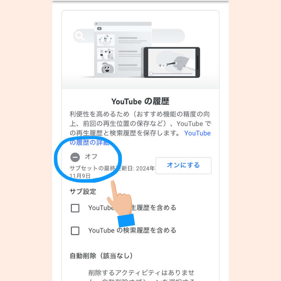 Youtubeも再生履歴をOFFにして、おすすめ動画や関連動画が出てこないように設定しています。